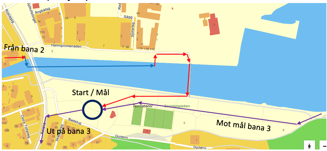 Bana 3 (lila) har längsta sträckan för både löpning och simning. Löpning ut med hamnkajen, mot Kvisthamrabacken, med en tur upp i skidbacken och ner. Sista simsträckan startar vid Badberget och går tvärs över Kvisthammraviken tillbaka till Kärleksudden. Efter denna simsträcka är det upploppet till målet som är vid Socitetsparken.