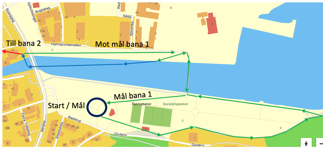 Bana 1 (grön) är det första och kortaste varvet. Start vid Socitetsparken och sedan löpning i parken, över gångbron för en kort simning i hamnbassängen. Sedan löpning tillbaks till mål i Socitetsparken